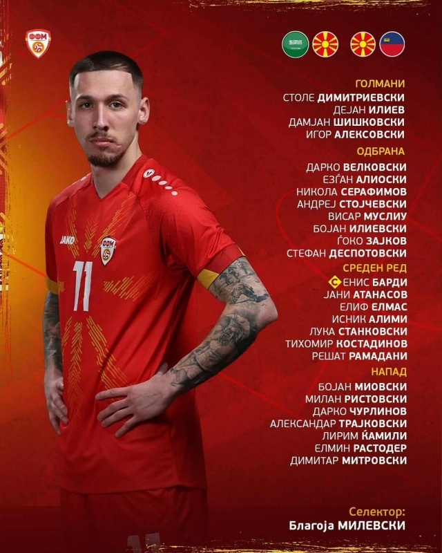 Од составот отсуствуваат Агон Елези, кој се повреди играјќи за Сараево, како и Манев и Ашковски.