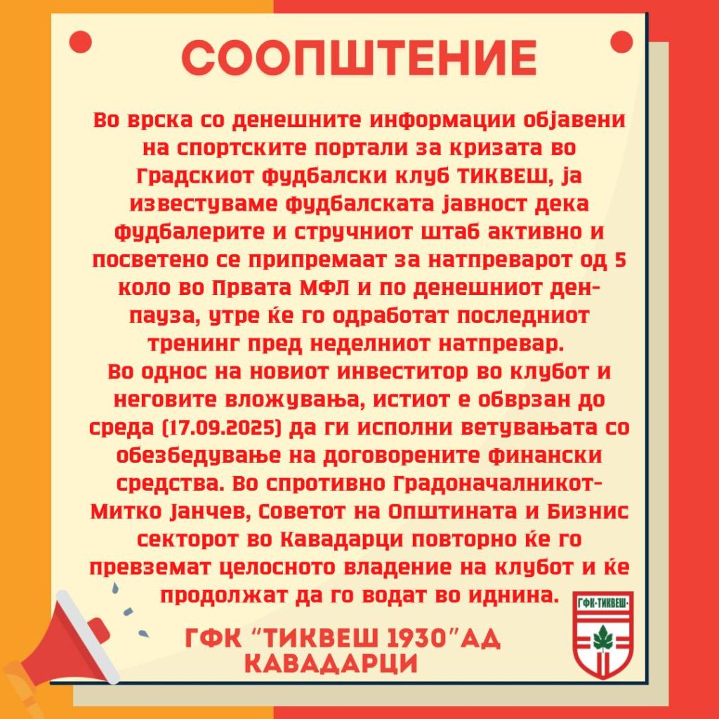 Ситуацијата стигна до критична точка, па Општина Кавадарци му постави јасен ултиматум на актуелното раководство – до 17 септември мора да ги исплати долговите. Во спротивно, новите сопственици ризикуваат да ги загубат акциите и контролата врз клубот.