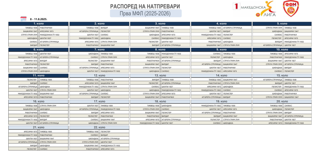 Фудбалската федерација на Македонија (ФФМ) го објави распоредот за првите два круга од Првата македонска фудбалска лига (ПМФЛ), а стартот на сезоната е закажан за 8 август. Според новите правила, колата ќе се играат во текот на три дена, со цел поголема гледаност и флексибилност во распоредот. Трофејот ќе го брани Шкендија, која во првото коло игра дерби со Шкупи во Тетово. Најголемото внимание го привлекува вечниот дерби дуел Вардар – Пелистер, кој ќе се одигра во Скопје.