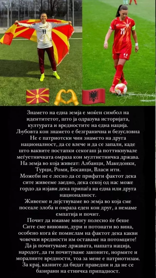 Не престануваат реакциите по синоќешното палење на македонското знаме на улиците на главниот град Скопје. За ова реагираше и поранешната репрезентативка, Афродита Салихи која на својот Фејсбук профил истакна дека не е патриотски чин знамето на друга националност да се влече и да се запали. „Знамето на една земја е моќен симбол на идентитетот што ја одразува историјата, културата и вредностите на една нација. Љубовта кон знамето е безгранична и безусловна. Не е патриотски чин знамето на друга националност да се влече и да се запали, каде што ваквите постапки секогаш потикнувале меѓуетничка омраза во мултиетничка држава“, вели Салихи.